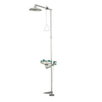 El lavaojos funciona con una placa de empuje, o con un pedal de accionamiento, ambos en acero inoxidable.Para ello, el accidentado tendrá que tirar de la “manija triangular” hacia abajo, y colocarse bajo la flor de la ducha, presionar la “placa de empuje” hacia atrás, o accionar el pedal, colocando sus ojos frente a las boquillas rociadoras del lavaojos.